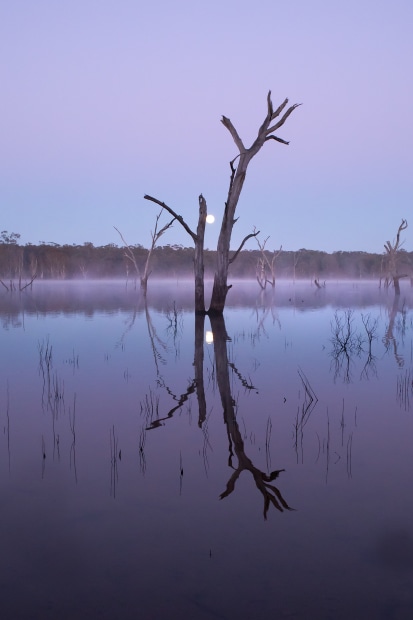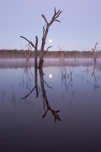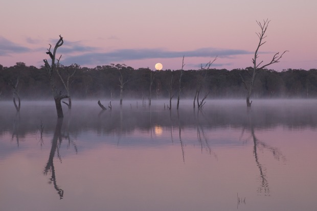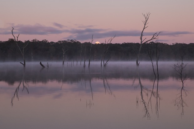 Misty morning meets a setting moon. This majestic combination happened at Lake Eppalock, near Bendigo, in Victoria, last winter. The stark beauty of the skeletal trees provided a fitting foreground.