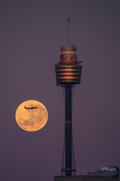 As dusk deepened over Sydney, a plane traced its path across the rising moon beside the city’s tallest landmark. A single moment of perfect alignment, where flight meets light, and the urban meets the celestial.