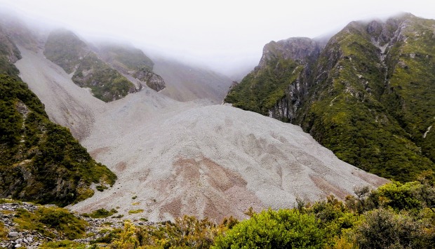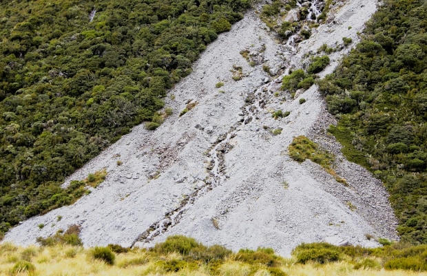 Morraine ( rubble ) slides are common due to constant uplift of the Southern Alps by the alpine fault line and extreme weather.