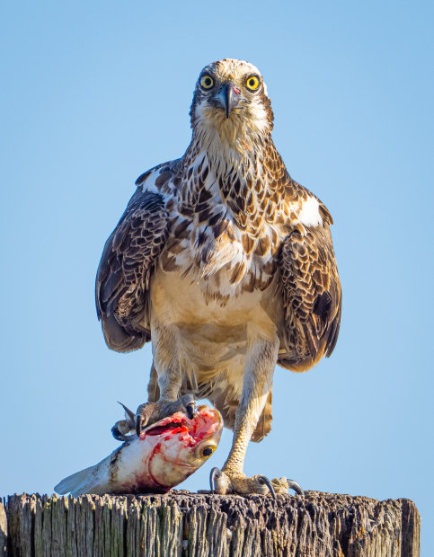 A threatening stare from the local osprey as i come upon its dining pole as i walk along the breakwall. It had already been feasting on its catch. No shortage of fish for the worlds best fish hunters here in Iluka Bay, NSW. A beautiful bird.