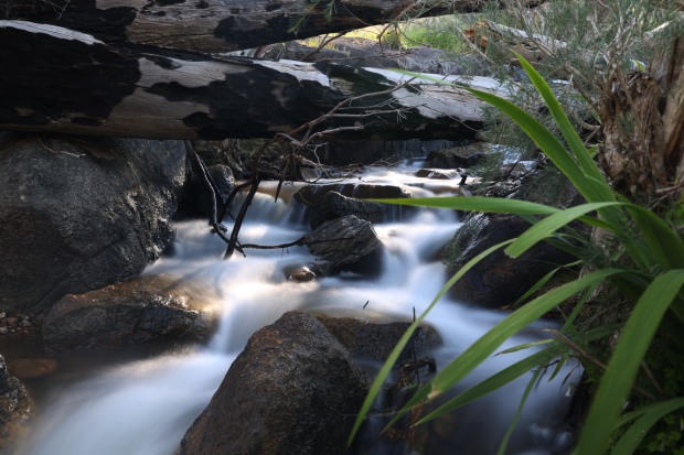 This serene image captures the beauty of a sunrise beaming onto a flowing stream, with crystal-clear water gracefully cascading over rocks.