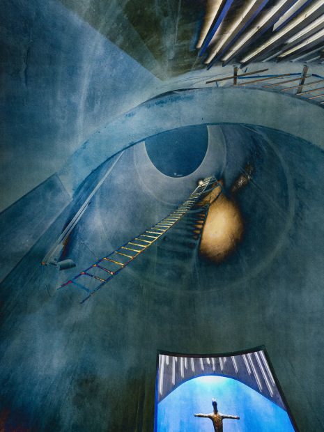 The interior of the wonderful Northern Lights Cathedral in Alta, Norway, looking up into the funnel. The image was shot wide to take in the unique altar in the background, as well as the interesting features within the void itself. The image was texturised with an overlay of my own making to enhance the luminous, ethereal quality of the space.