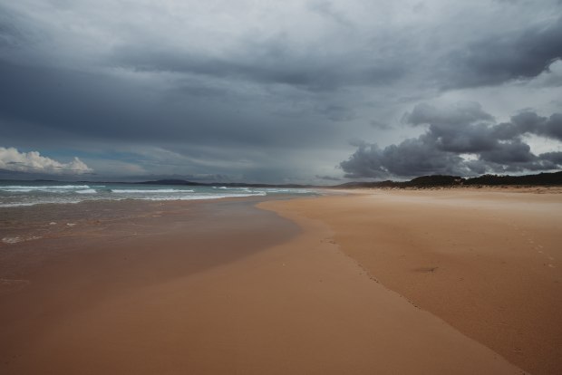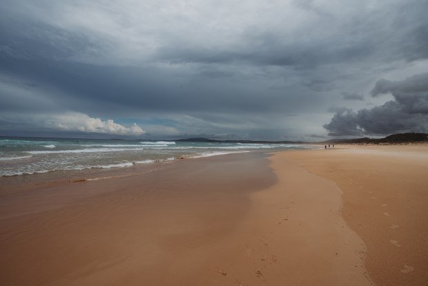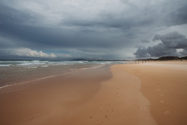 I was taking some photos of beautiful ocean along the saphire coast in NSW, the clouds were rolling in and it was getting to evening time, one single runner up ahead, so just those lonley footprints on the sand. Four motorbikes appeared from the dunes, it was just a cool experience for something startling to happen in that scene. I had a prime lens so no way to zoom but it worked regardless.