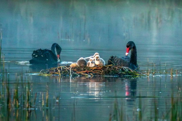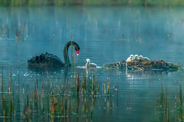 In the wild in a lagoon at Potato Point on the NSW south coast, I visited these swans twice daily for over a month. I watched them build a nest , lay eggs and then take turns sitting on the nest in some freezing temperatures. Then on day 35 the eggs began hatching - five of the six eggs hatched. - oh, the love of nature. So inspiring watching them take turns looking after their young.