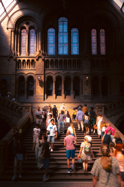 Visitors on the steps of the Hintze Hall in the Natural History Museum, London. August 2025.
