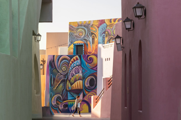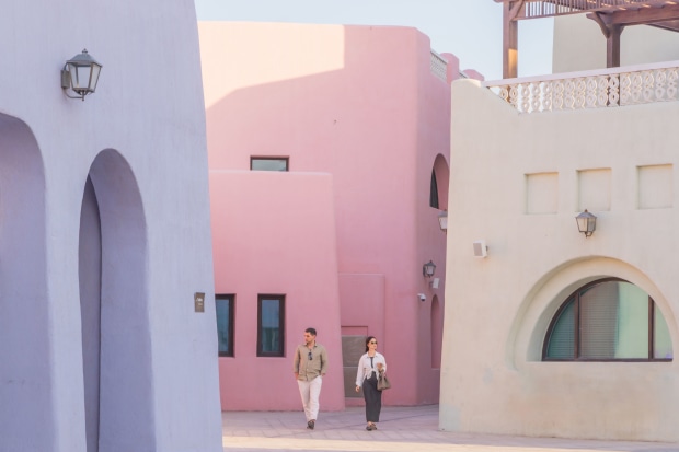 Set amidst pastel walls and sunlit alleys, this series captures the quiet rhythm and vibrant heart of modern Arabian architecture — where art, people, and place meet in harmony.
