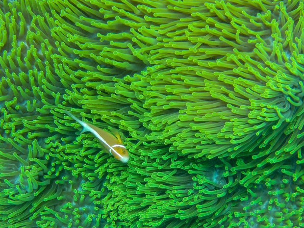 This is a Pink Anemone fish, (Amphiprion perideraion) I saw while snorkelling at Agincourt Reef in the Great Barrier Reef.