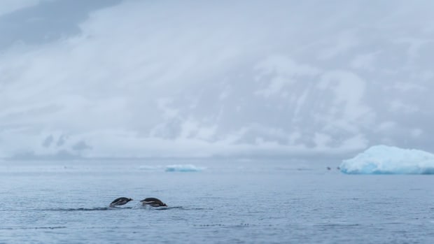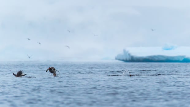 A sequence of photographs capturing Gentoo penguins porpoising through Antarctic waters. They show the efficiency and grace as they travel at speed through icy water.