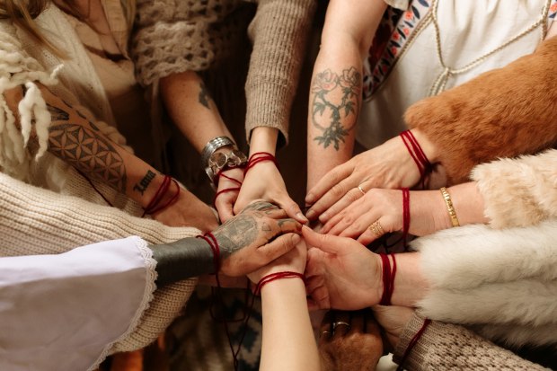 A circle of women’s hands bound by a crimson thread, symbolising sisterhood. The red evokes blood; the shared pulse of life, lineage, and renewal. This image honours enduring traditions where women unite to reclaim bodily wisdom, celebrate connection, and weave collective strength through ritual and care.