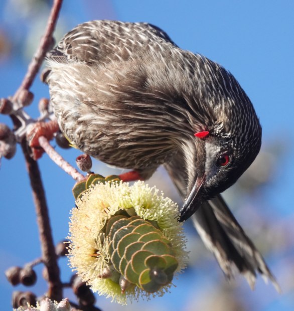 Red Wattlebirds are our largest honeyeater and vigorously defend their favourites nectar giving trees.