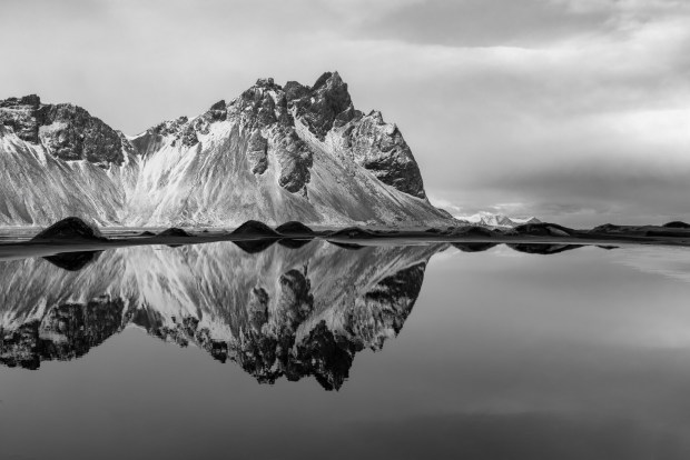 The reflection of Vestrahorn is accentuated in the tidal lake due to the submerged black sand, lending itself to a visualised black and white image.