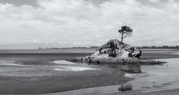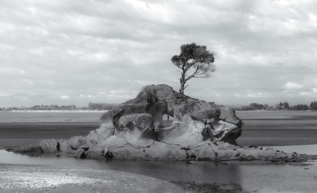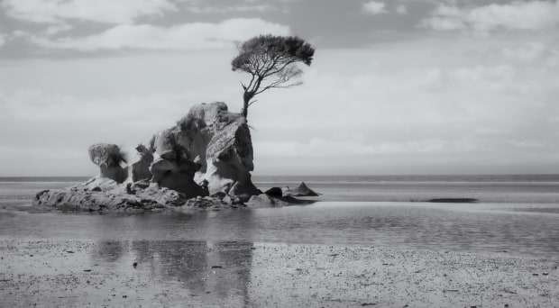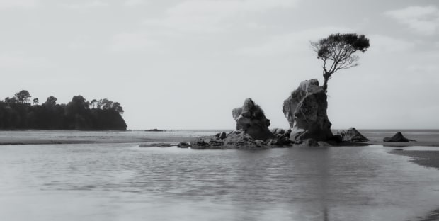 A study in endurance and isolation, this black and white series captures a lone tree clinging to sculpted rock along the Motueka coast