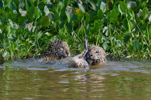 The ruling matriarch of the Pantanal Norte, named Patricia by the local biologists, and her cub known as Makala, retrieve the body of a Yacaré caiman (Caiman yacare) from the Corixo Negro. A couple of days before, near the mouth of the Rio Piquirí, we’d seen a black vulture (Coragyps atratus) trying to balance on the floating corpse of a caiman as it tried to feed. The caiman was likely killed by a boat strike, then washed into the Corixo Negro, where Patricia and Makala later retrieved it.