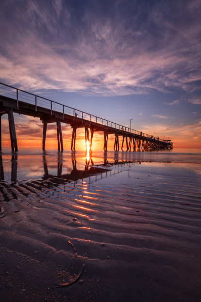Shooting on a beach is like a treasure hunt...you never know what you can find. When I plan a sunset shoot on any of our South Australian metropolitan beaches, a jetty is always a feature. I shoot it from various angles and in the changing light. With a cool foreground of sandy patterns, ripples, wave movements, tidal pools, or interesting rocks, each shot turns out unique and unforgettable.