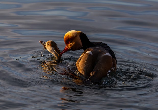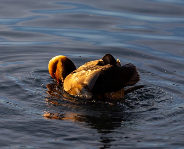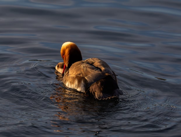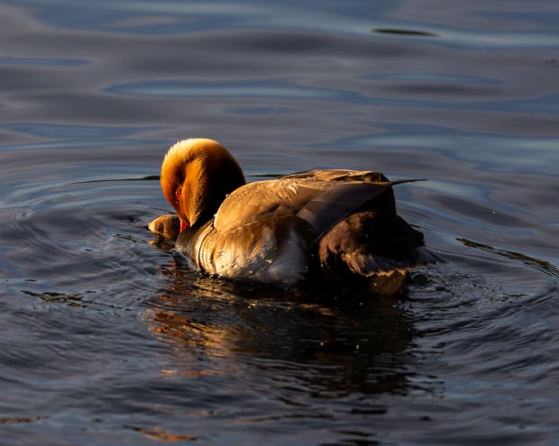 A male Red-crested Pochard's instinct is to ensure the gene line is continued and knows there is a short window to mate and for the female to raise the next clutch of chicks. The sun is low in the sky highlighting the fear on the female's face as the male grabs hold of her and pushes her head under the water sometimes resulting in death if she cannot get back to the surface to get air. It is frantic and desperate as she tries to get away which she does and not sure if the male achieved his ultimate goal.