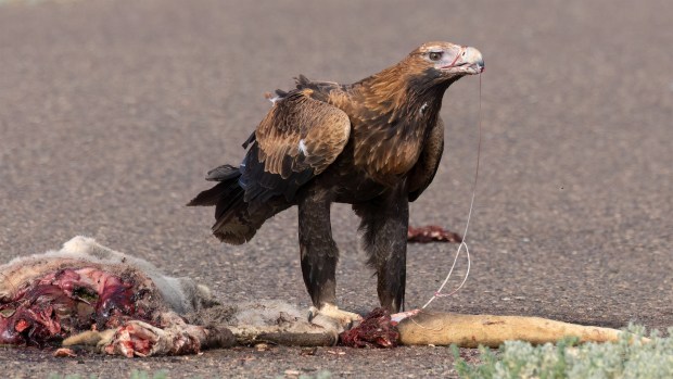 Wedge-tailed Eagle feasting on the tendons in the tail of the dead kangaroo on the road. When spotted, I cautiously got out of the car, grabbed my camera and started walking slowly towards him whilst taking photos at every opportunity. As cars passed, he flew off a couple of times and would always return to the roadkill.