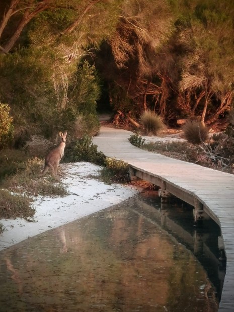 'Roo', captured on my evening walk along the Merimbula Lake boardwalk, holds a moment of stillness where land, water, and light meet. A lone kangaroo pauses at the edge of the path, framed by golden dusk and the quiet reflection of the bush—an image of calm, presence, and belonging.