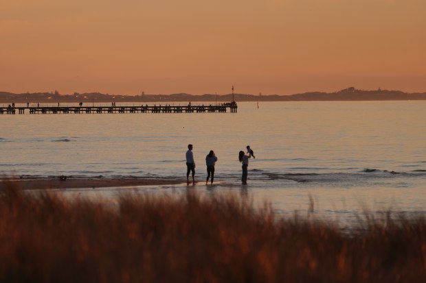 Wintery sunset photo from McCrae lighthouse looking towards the Rosebud Pier, in Victoria.