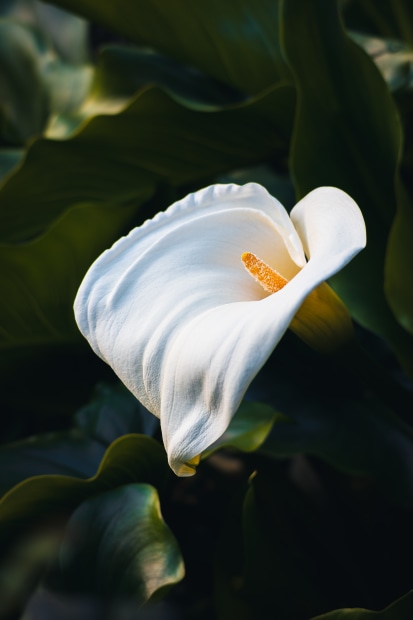 In the fading glow of evening, a single lily becomes more than a flower — it transforms into a sculpture. The sweeping white petal curves like carved marble, while the golden stamen catches the last light, radiating warmth against a deep green backdrop.