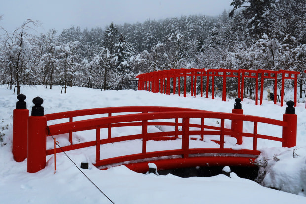Japan: Snowy silence, whispers of prayer, Blossoms and steel with timeless tranquility