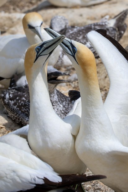 At Muriwai on the north west coast of New Zealand's North Island, hundreds of Australasian Gannets migrate seasonally to lay their eggs and raise their chicks. They steadfastly await the return of their mates from foraging flights, meeting again with graceful dances, and together raise their chicks above the pounding of the sea.