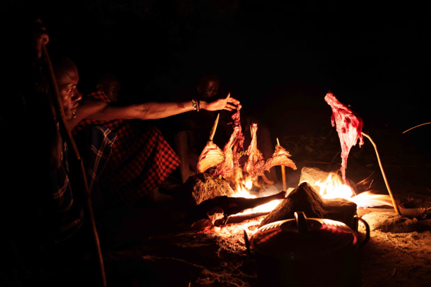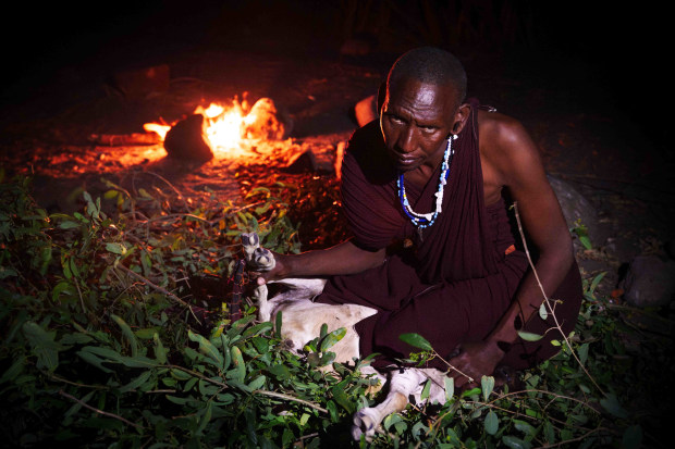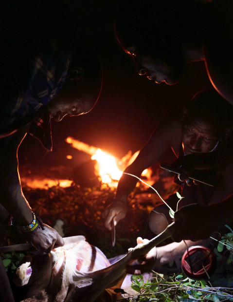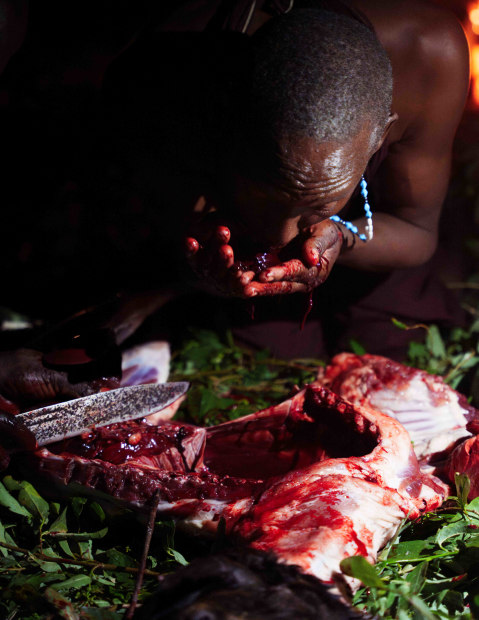 Location: Remote Tanzania When staying with the Maasai, it is customary to bring a goat/sheep as a gift for the family hosting you. The Maasai treat livestock as currency as well as a resource - preferring to consume their milk and blood, rather than their meat which is a one time affair and therefore reserved for special occasions. The slaughter process is wildly different to how it's done in the west. They suffocate the animal in order to keep the blood inside and then proceed to carefully butcher the animal, slowly draining all the blood into the chest cavity. Once portioned and drained, they char the gallbladder to flavour the blood before drinking it. It was a wild experience to witness and humbling to have been invited to share a meal and photograph the process.