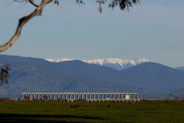 The amazing view which can be seen in winter from Albury. In the image you can see the Hume Dam Wall and Snowy Mountains in the background.