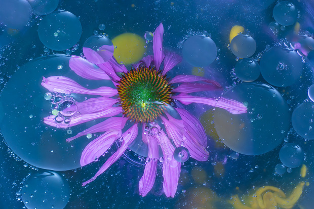 A delicate echinacea flower floats serenely on water and is surrounded by bubbles of oil. The interplay of texture and colour creates a dreamlike image that celebrates nature's beauty in an unexpected form.