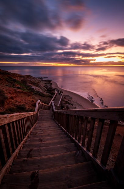 I frequently travel to one of the best locations for sunset photography in South Australia - the iconic lookout with long stairs leading down to the beach at Southport. This place, with an instant leading line for a composition, offers a spectacular view. Whether it's an amazing colourful sunset or a gloomy grey sky, we almost can't go wrong with our shots there!