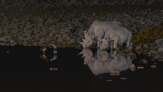 Under the hush of the night in Etosha National Park, a mother rhino and her calf approach the watering hole. Their mirrored forms are a peaceful reflection of kinship and survival in the wild.