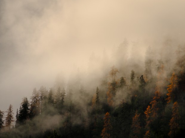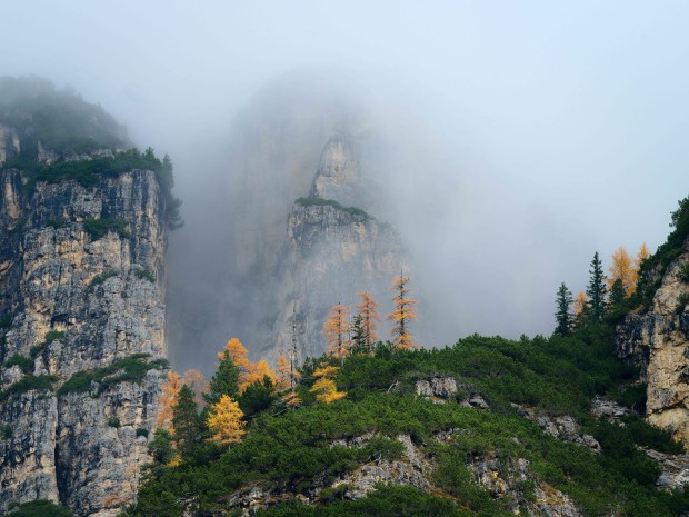 Slowly rising clouds and mist reveal the fiery stillness of autumn in the alps