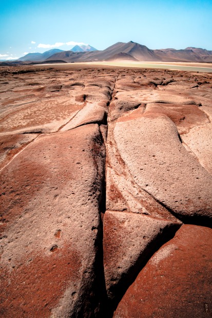 Stones forming shapes and lines looking like waves guiding us to the mountain at the back. Atacama, Chile.
