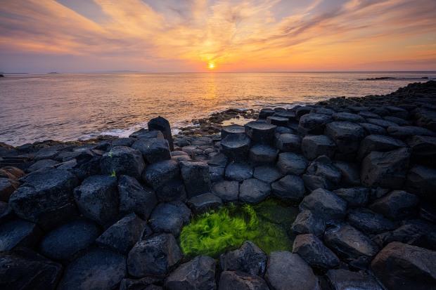 At Edge of the Northern Ireland, Where land meets the Atlantic, The Giant's Causeway unfolds like nuture's own masterpiece-thousands of hexagonal stones shaped by ancient fire and time. As sun sinks into the sea, the rocks glow with a quiet warmth, each basalt column whispering tales of myth and creation.