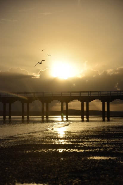 Taken in Hervey Bay Queensland at Sunrise and low tide at the Urangan Pier. I was able to capture the beautiful colours as the sun rises above the clouds and over the pier and the seagulls are in flight.