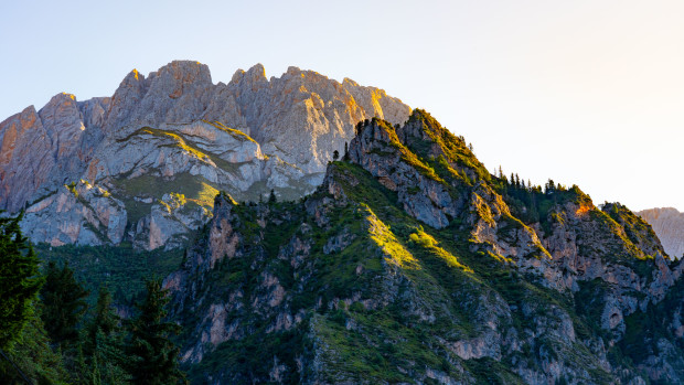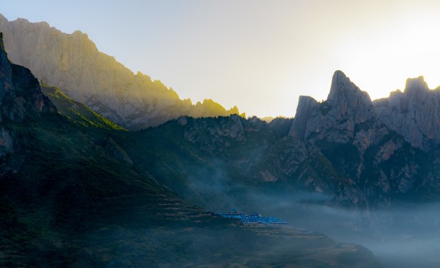At sunrise in Zagana, China, golden light spills over jagged mountain peaks, casting long shadows across a valley wrapped in mist. Nestled quietly within this ethereal scene is a temple with blue rooftops, its presence humble yet profound against the grandeur of nature. The interplay of light and cloud evokes a sense of spiritual stillness—where the mountains seem to breathe, and the temple stands as a silent witness to the awakening day.