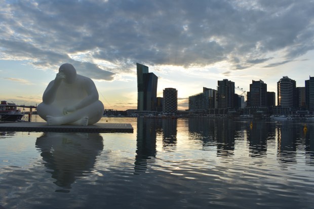 The sunset moment during the Firelight Festival in Docklands, Melbourne this year. It features the huge inflatable sculpture and docklands buildings shining in the sunset lights.