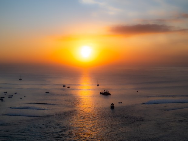 The sun setting over Jungut Batu beach in Nusa Lembongan (Indonesia). The day comes to an end when surfers are having their last waves and boats come to rest.