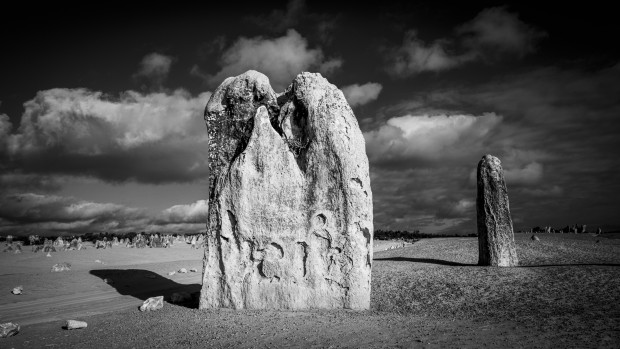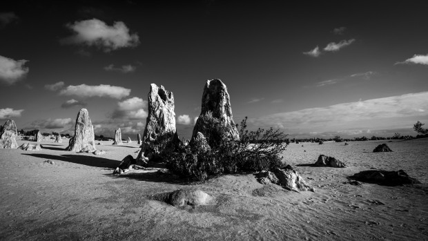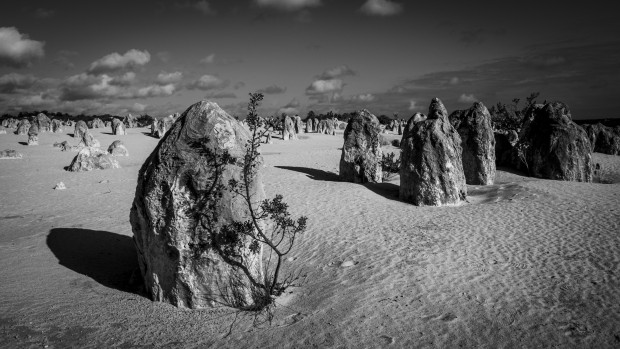 While touring the Pinnacles Desert in Western Australia, I was captivated by the array of natural sculptures. In the first image, a single prominent pinnacle draws the eye, standing tall in the dramatic light of the lowering sun. The second reveals a strangely shaped formation that almost seems to bear ghost-like faces, adding a surreal, mysterious quality. In the third, a small rock formation is accompanied by a growing plant, juxtaposing life against the stark desert landscape. The fourth captures two striking pinnacles surrounded by a low bush, emphasising the quiet resilience of nature. A scattering of clouds adds soft texture to the sky, contrasting with the rough, weathered limestone surfaces. Footprints in the sand hint at past visitors, yet with no one in sight, the scenes retain a profound sense of isolation. Presenting the series in black and white enhances the eerie, atmospheric feeling that lingered in those moments.
