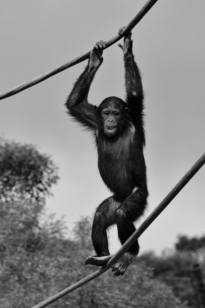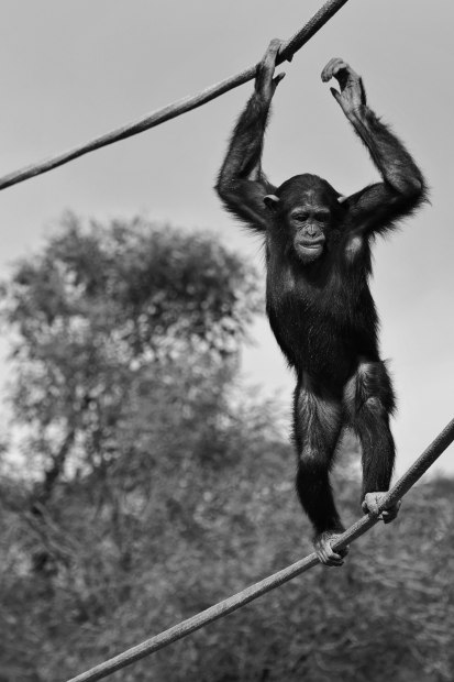 Chimpanzees are extremely agile acrobats, due to their long arms, feet with opposable big toes, and flexible joints.