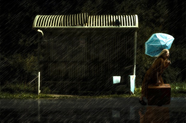 This is a composite with my friend shot in the studio and then placed into a photo of a local bus stop