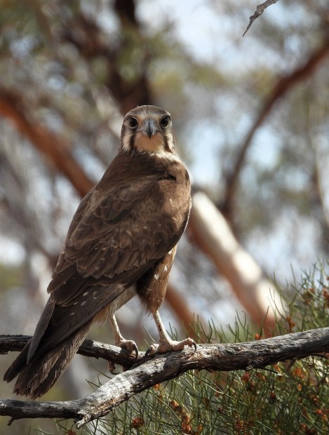 Talk about right spot, right time. I was just leaving Gluepot Reserve and this Brown Falcon land just in front of the car. It then leisurely walked across the red road and flew onto a branch and just watched me with its beady eyes, seemingly looking straight through me. It didn't seem to be camera shy. It was an amazing experience being so close to such beautiful bird.