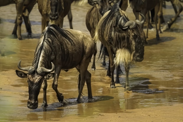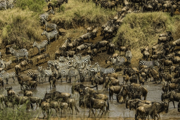 Wildebeest, zebra and other grazers move between the Serengeti and crossing the Mara river in Kenya Masai Mara