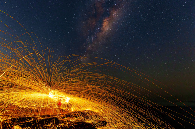 This creative idea and shot came into mind when we went for a milky way chase, where there's no particular foreground to capture while the core was already up. With the idea in mind, initiated a steel wool spin with the help of a friend which points towards the milky way core to show that its generated from the fire - so called the capture ''The Milkyway Creator' Foreground of the spin captured separately while the stars captured in calm dark night with numerous attempts of failures, finally got these two perfectly aligned shots stitched together with the help of lightroom and photoshop.