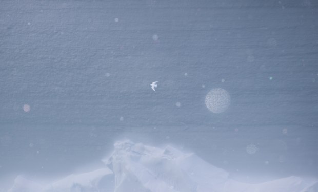 A Snow Petrel glides along an 30m high ice shelf as snowflakes get whisked off the exposed ice and crystals glisten in the air.