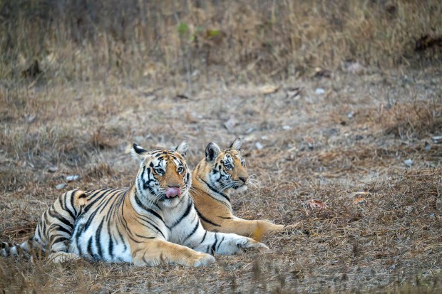 A mother Bengal Tiger rests after a night of hunting while entertaining one of her 4 energy filled cubs in Pench National Park.