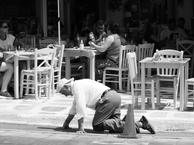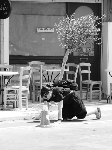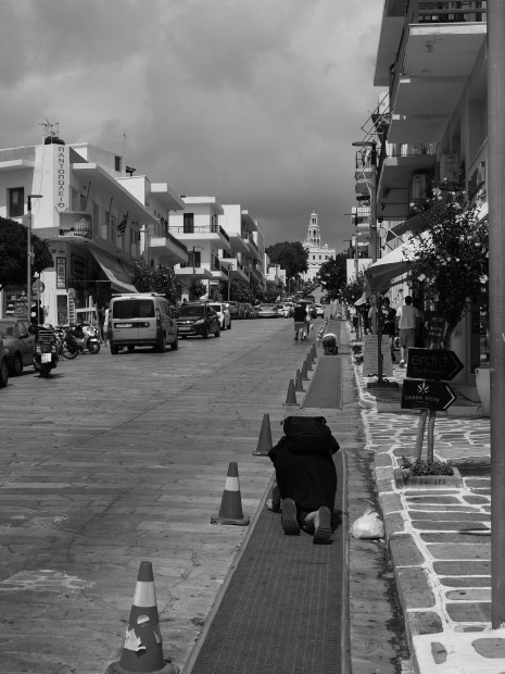 Pilgrims have been visiting Tinos Island for centuries to visit the Church of Panagia Evangelistria. August is a particularly busy time for pilgrims as they celebrate the Dormition of the Panagia, or the passing of the Virgin Mary from earthly life, celebrated annually on 15 August. Many pilgrims will make the 800m long journey from the port to the Church on the hill on their hands and knees. I watched and appreciated this man prepare himself in the hot midday sun, then followed his journey. It was extraordinary to experience.