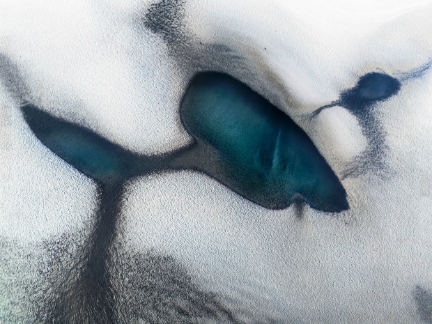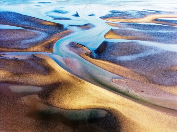 A maze of channels, ponds, and sandbars are exposed at low tide at Toogoom Beach Cove, Queensland.