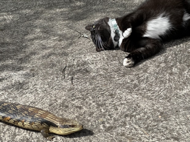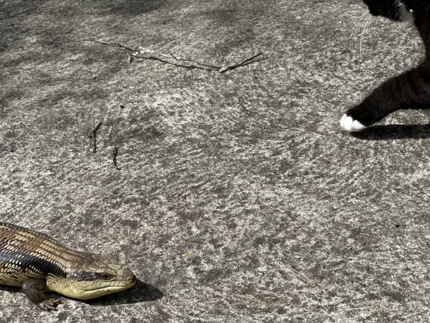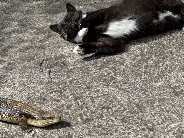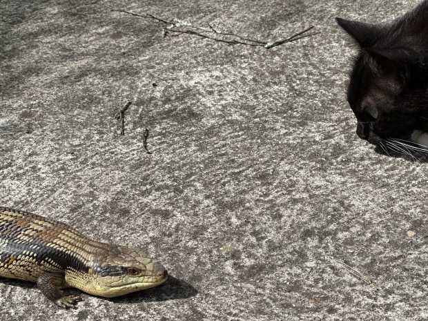 Unexpected Meeting captures a rare moment of peace and curiosity between a domestic cat and a blue-tongue lizard — coexistence in its gentlest form.