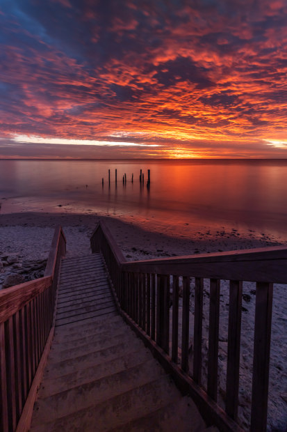 The old jetty remnants at Port Willunga, South Australia attract lots of photographers, even from interstate. The stairs leading down to the beach offer an instant composition for our shots, and the sun setting behind the jetty ruins gives a perfect backdrop to the picture. And if it happens to be as incredible, as I captured it that evening, the experience is truly unforgettable!