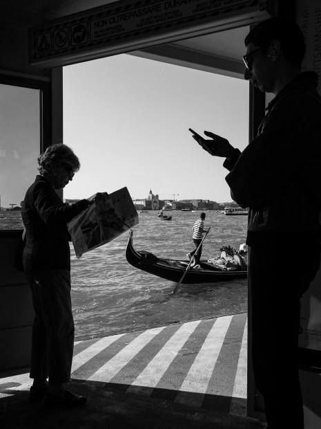 Waiting with the locals for the early morning vaporetto to San Giorgio Maggiore. As I sat on the bobbing pontoon, framing the image of the landmark lagoon, the stylish lady and her broadsheet, juxtaposed with the uber cool guy scrolling his smart phone, waiting patiently for a gondola to come into view, all the while hoping my subjects wouldn't change their poses or turn around to look at me. Perfetto.